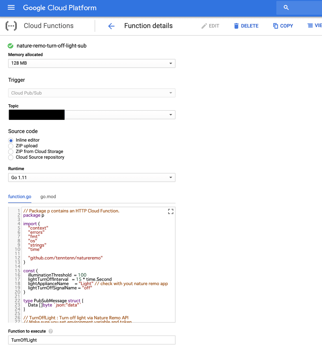 上記のセットアップが完了したら、Cloud Function にコードと go.mod の中身をコピーする。