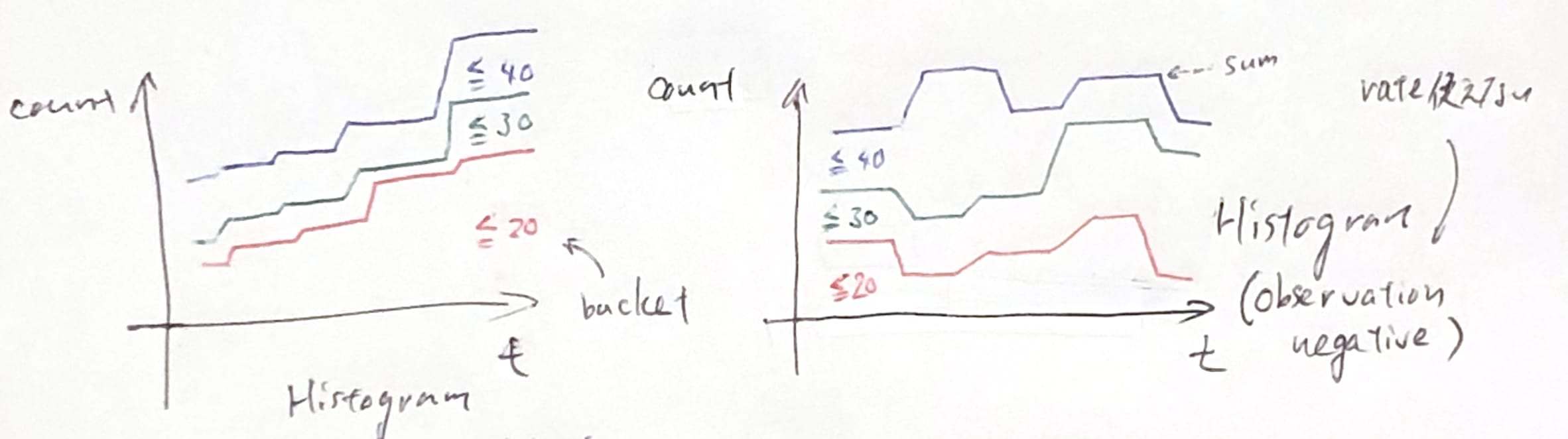 Observation という言葉が Histogram, Summary で出てきますが、これは観測値。 基本的に Observation が減らなければ (Observation が negativeでない)、左のグラフのように増加します。