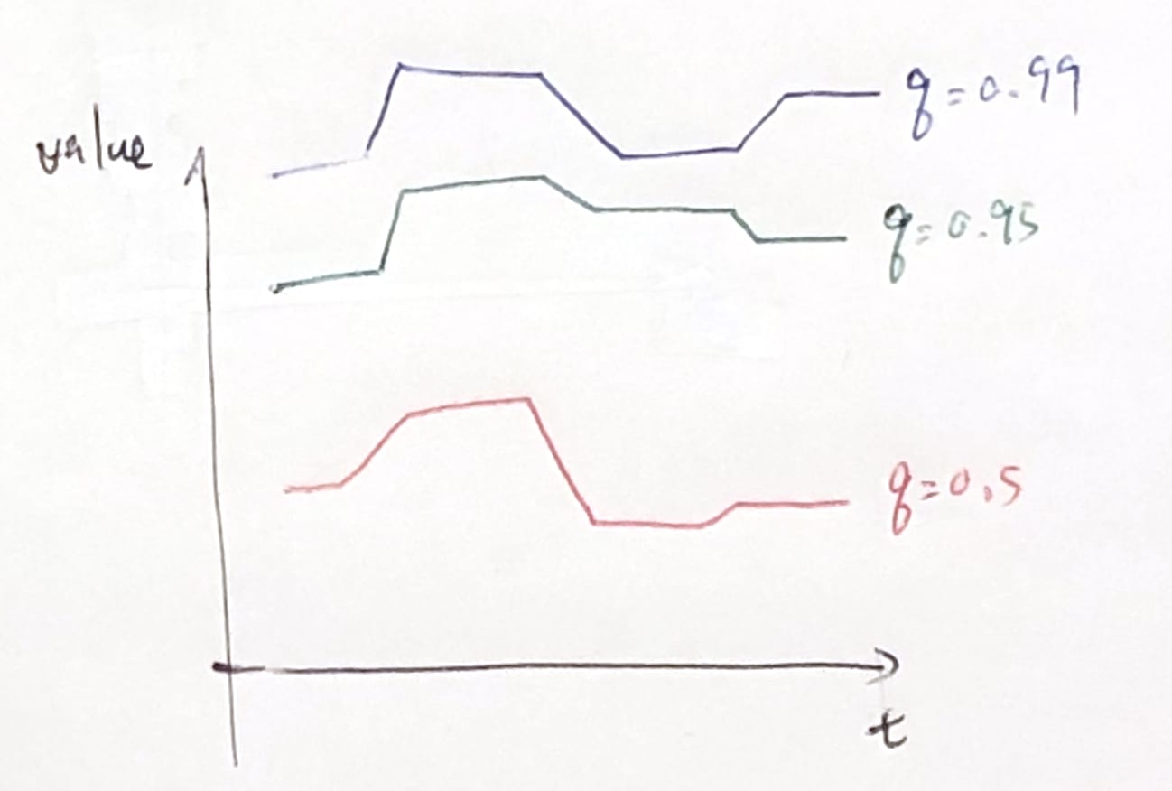 例えば、rank estimator が q = 0.5, 0.95, 0.99 のパーセンタイルとしたとき、ある時刻 t に得られた値すべてに対して、q = 0.5, 0.95, 0.99 になる値を計算します。