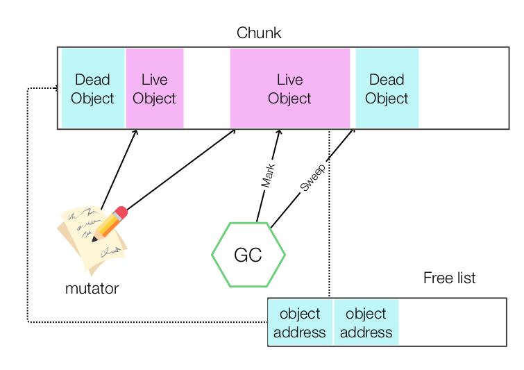 Copying GC の場合は、From -> To へ移す際に object のポインタの付替えを実施する。しかし、前述の FFI のことを考えると、C と Go 間でアドレスの変換をブリッジする必要があり、これはバグのもとになりそうだという背景もあった。 そのため、メモリの compaction を行うのではなく、mark and sweep ベースの GC が作れないか考えた。
