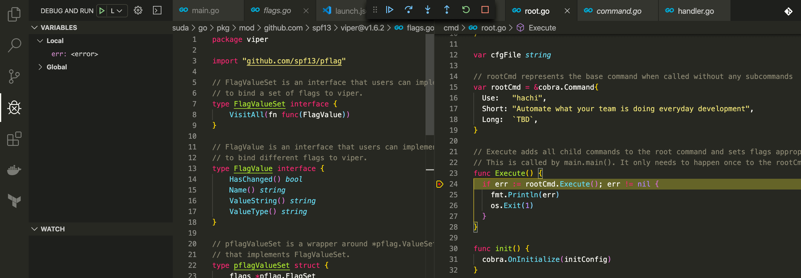 スタックトレースから nil pointer で落ちていること、hachi プログラムの中では、root.go の 24 行目での処理が失敗していることがわかる。 さらに、プログラム内で利用している viper ライブラリの flags.go 41行目で nil pointer が起きているようだ。