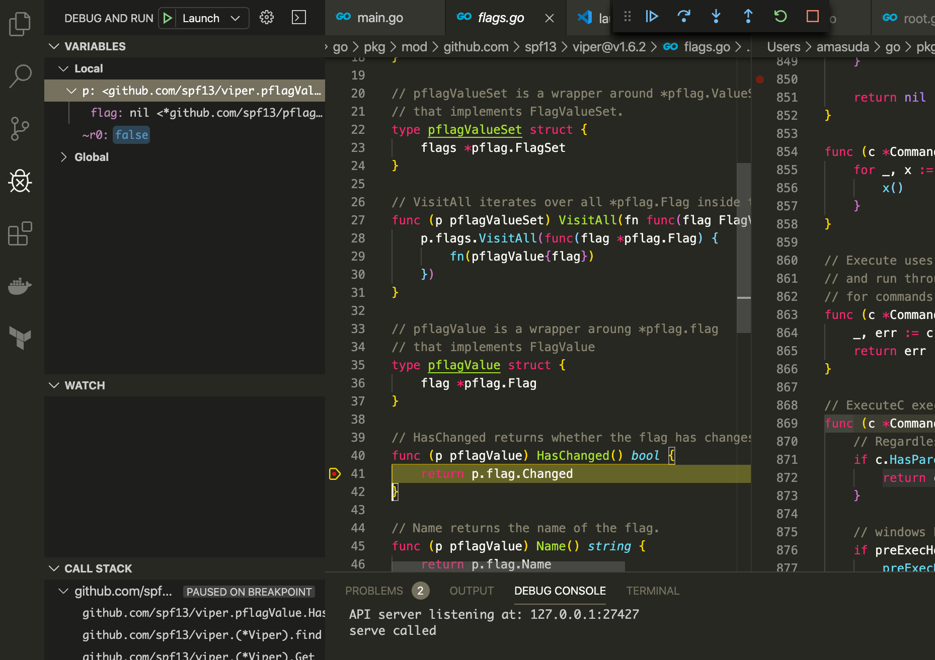 上記の通り、そのままデバッグを行ってしまうと、どこで落ちたのか、どのような変数が入っていたのか分からないまま異常終了してしまうため、root.go 24行と flags.go 41行目に break point を置いておく。