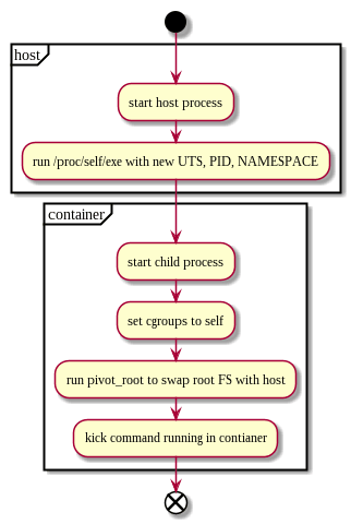 - ホストで起動したプロセスから、自分自身を再度呼び出す。このとき、実行オプションとして、新しい UTS, NAMESPACE, PID で起動する