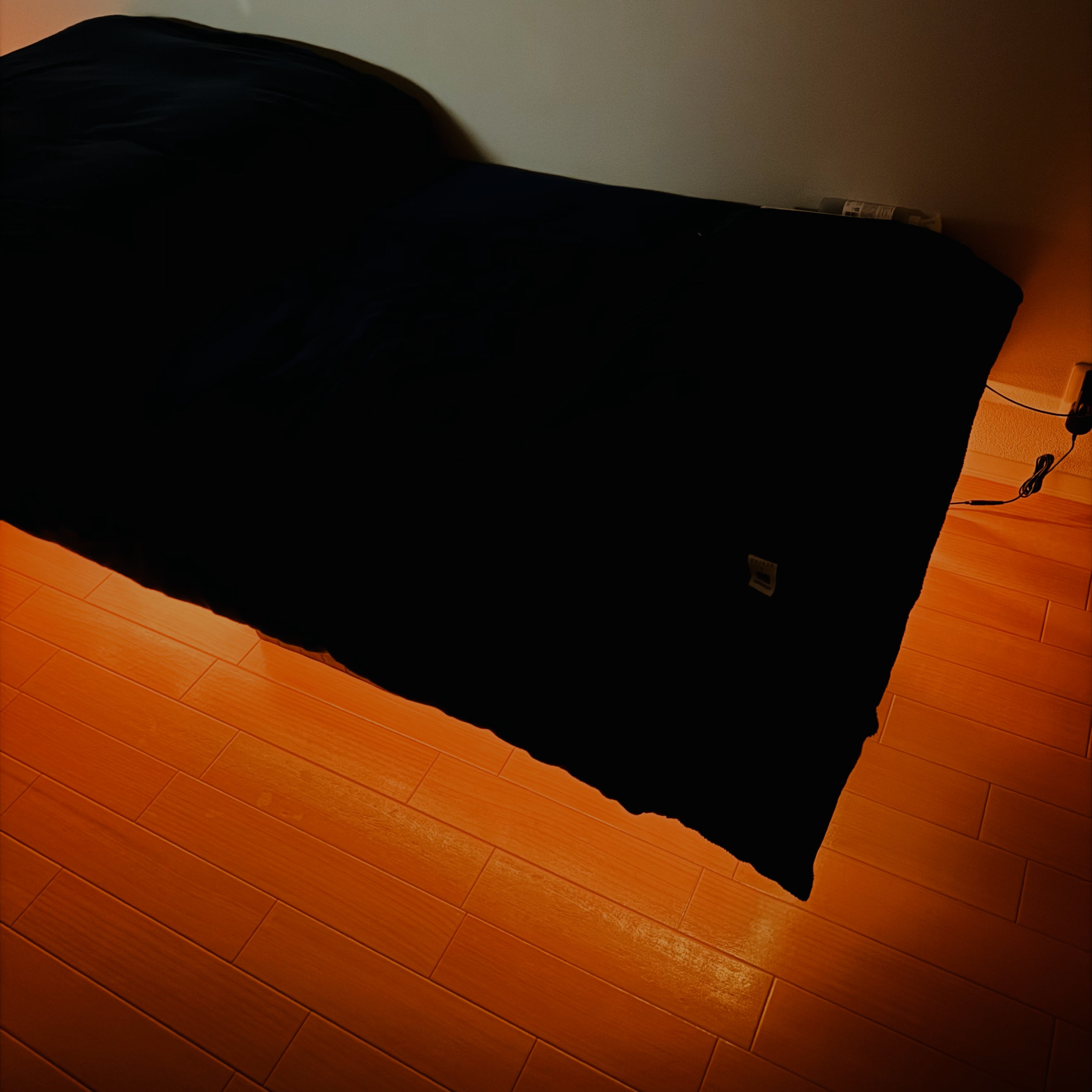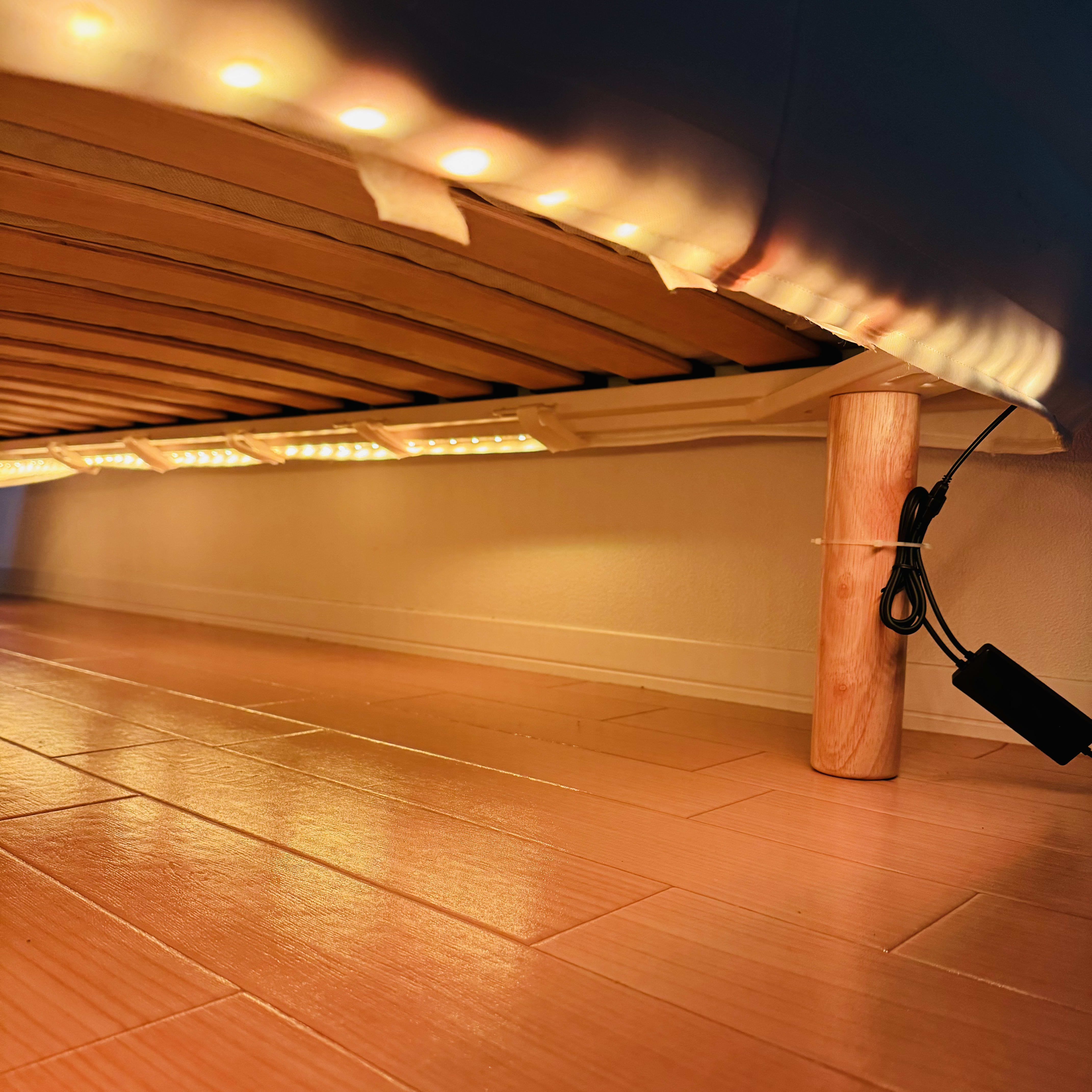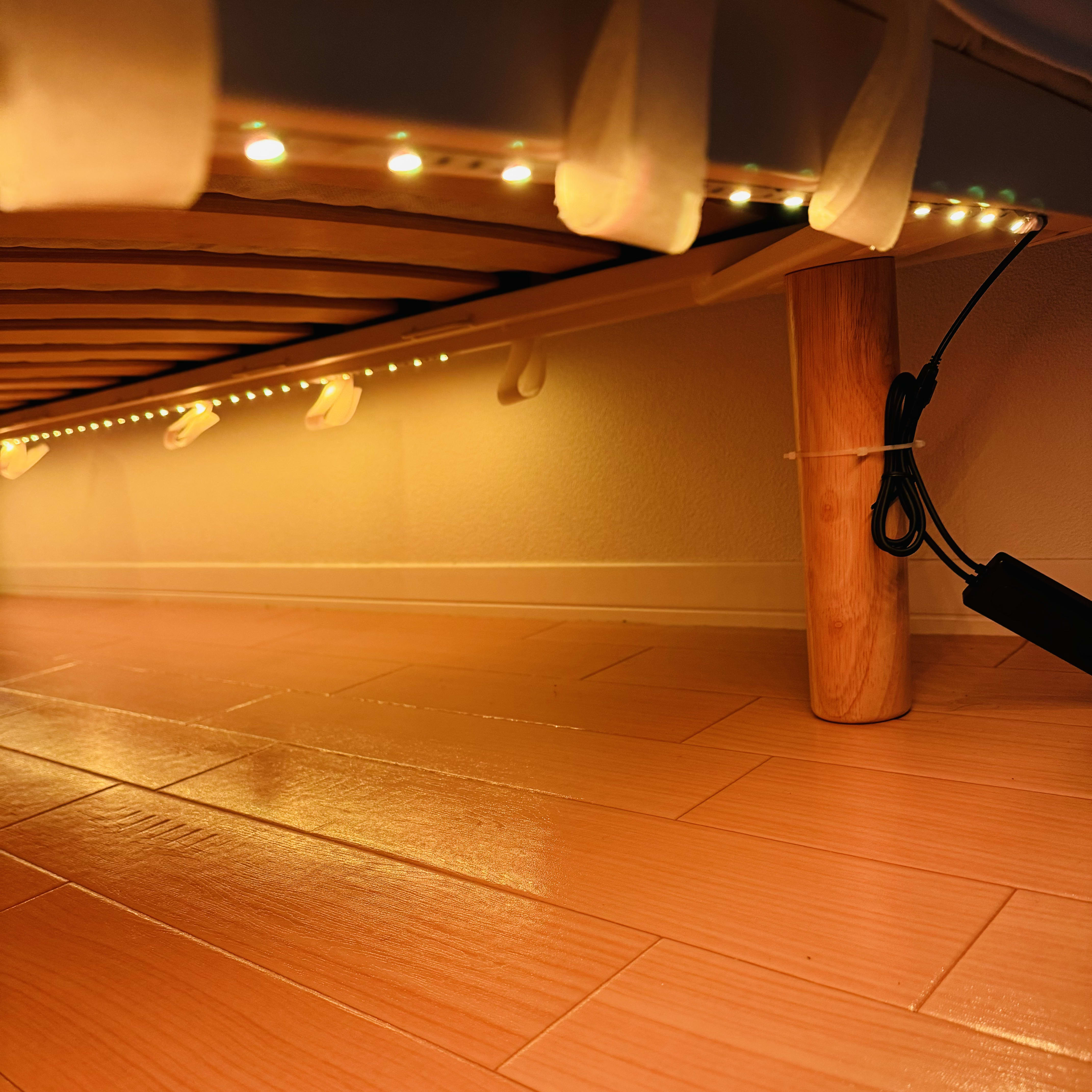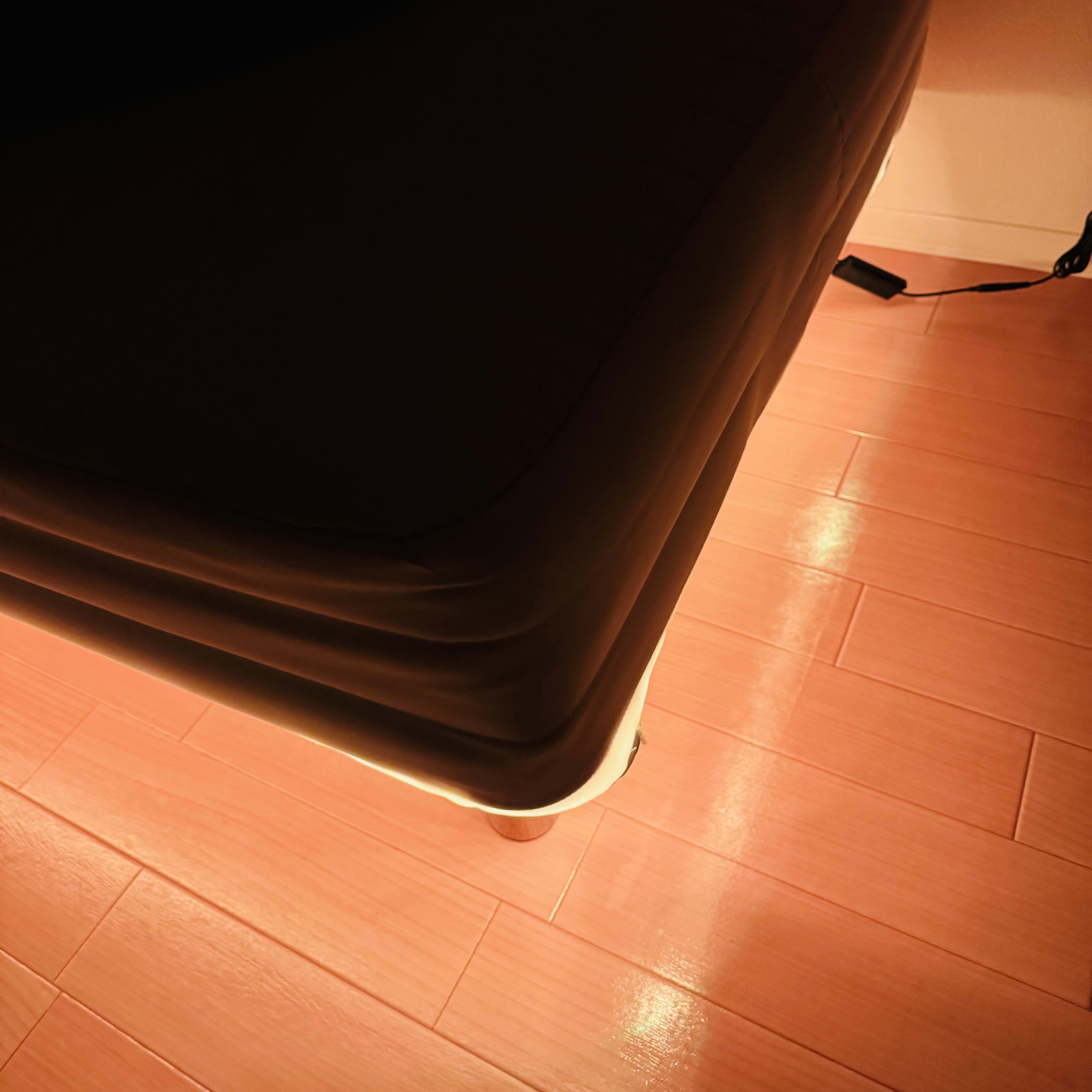 ベッドは、無印の脚付きマットレス を使っており、このシーツが良い感じに LED の光を分散してくれた。